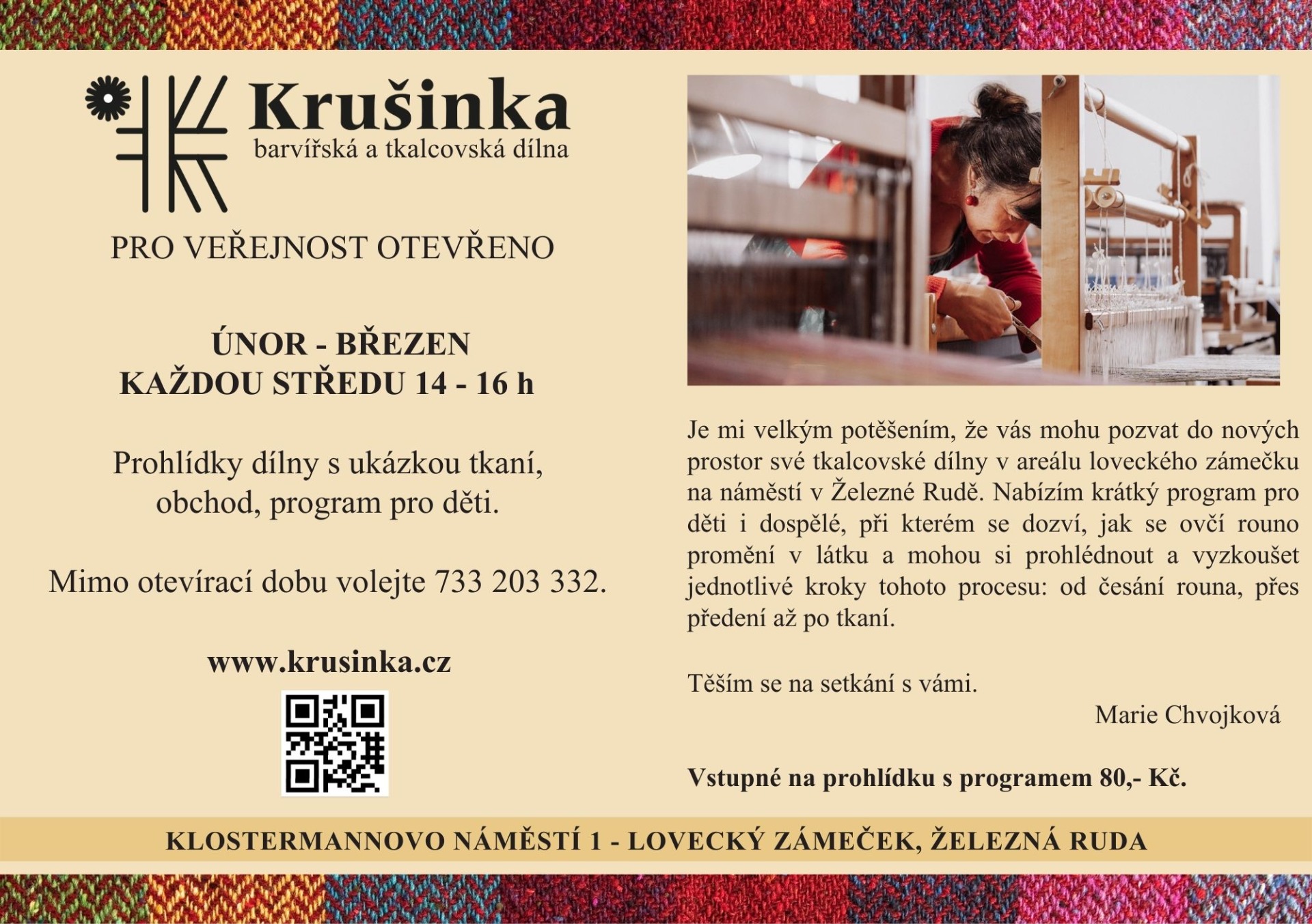 Kurzy tkaní u Maríi Chvojkové jsou jako výlet do jiného světa. Bude Vám připadat, že v útulné tkalcovské dílně na Železné Rudě, v srdci Šumavy, se zastavil čas. Dva dny strávené za tkalcovským stavem je balzám na duši. Ruce pracují a fantazie bloumá do míst, kam dlouho nezabloudila. Člověk je obklopen krásnými barvami příjemné příze a nostalgií dávno zapomenutého času a doby. Nejen duše se rozmazluje, ale i tělo nepřijde o své. Zámecká restaurace překvapí výbornou domácí kuchyní a když budete mít chuť na bramboráky, budou Vám servírovány přímo na místo. Po krásně prožitých dvou dnech povídání, tkaní i mlčení a vytváření se vracíte domů zabaleny do nádherné šály vlastní výroby a můžete být na sebe pyšné nebo taky ne, ale rozhodně spokojené, uklidněné a s úsměvem na rtech.